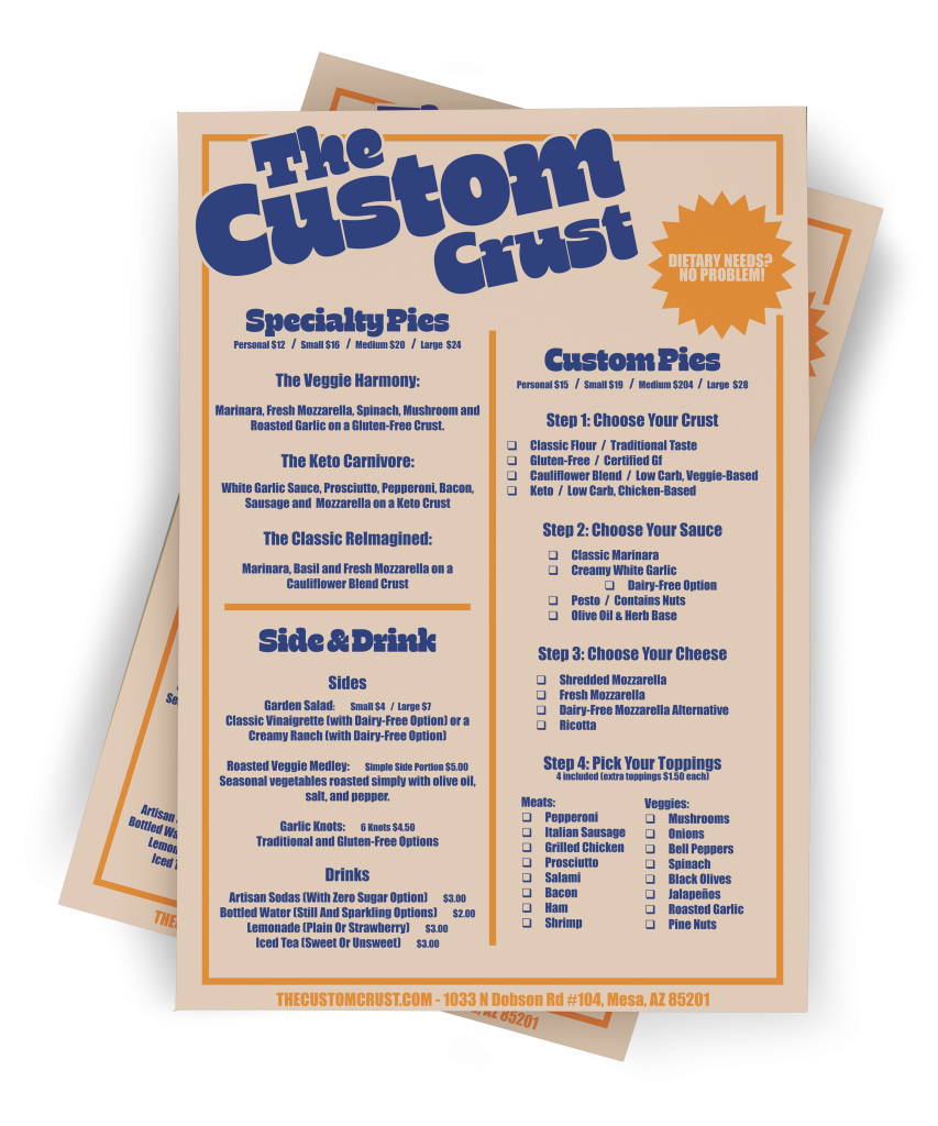 Print Menu Design for The Custom Crust. This menu was created with a clear, organized layout to present specialty pizzas and a step-by-step custom order form, making it easy for customers to navigate the choices.