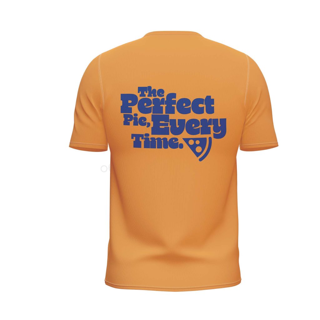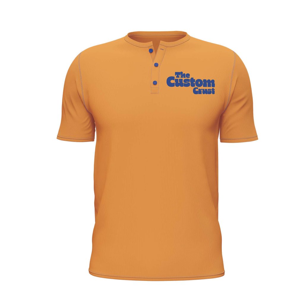 This image shows the design for the employee uniform shirt for The Custom Crust. The simple, clean design features the brand’s logo embroidered on the chest. The consistent use of the brand’s colors (orange and blue) helps create a professional and recognizable look for employees, reinforcing the brand identity every time a customer interacts with staff.